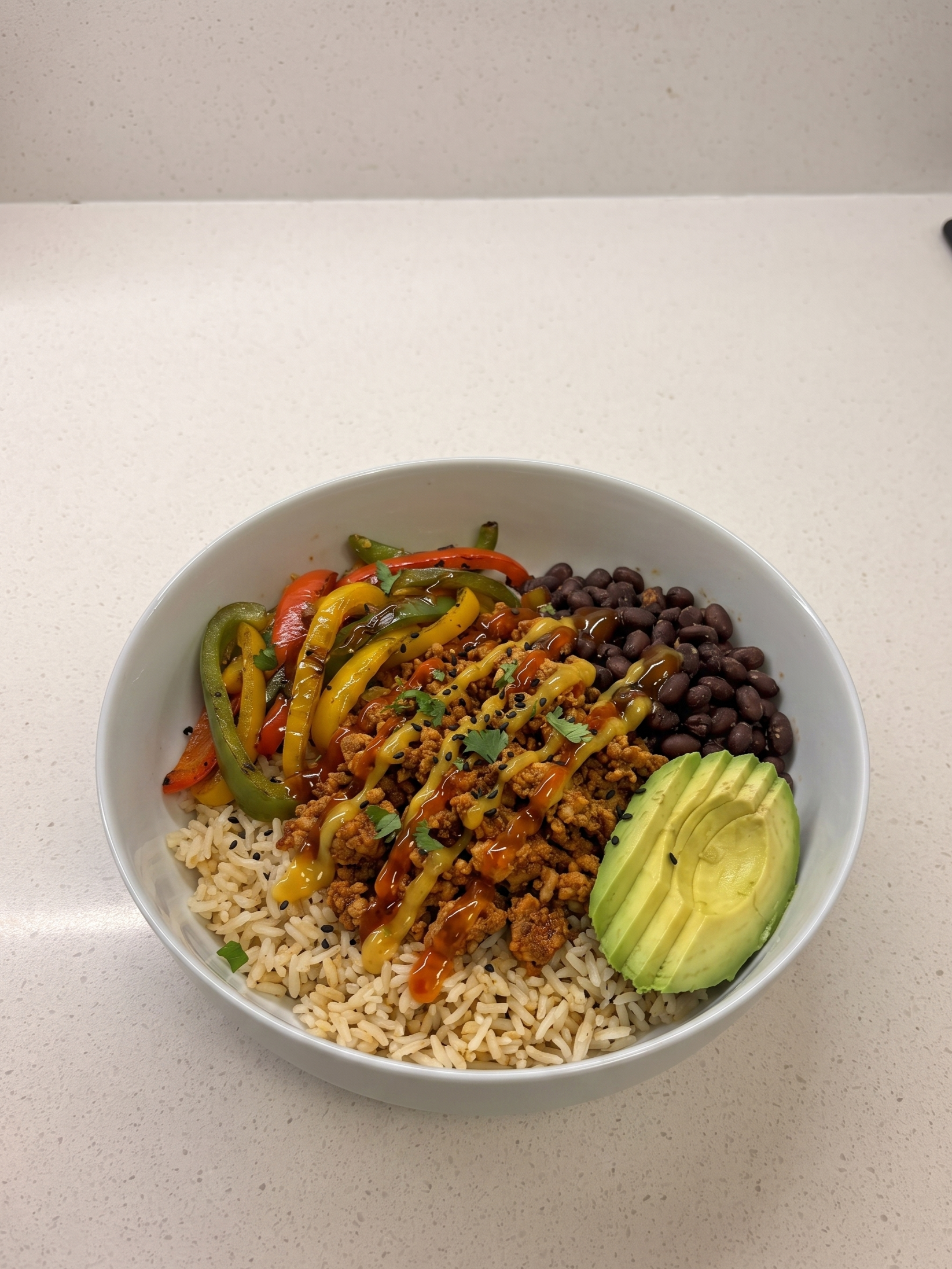 Build your bowl — rice first, then turkey, peppers, black beans and avocado